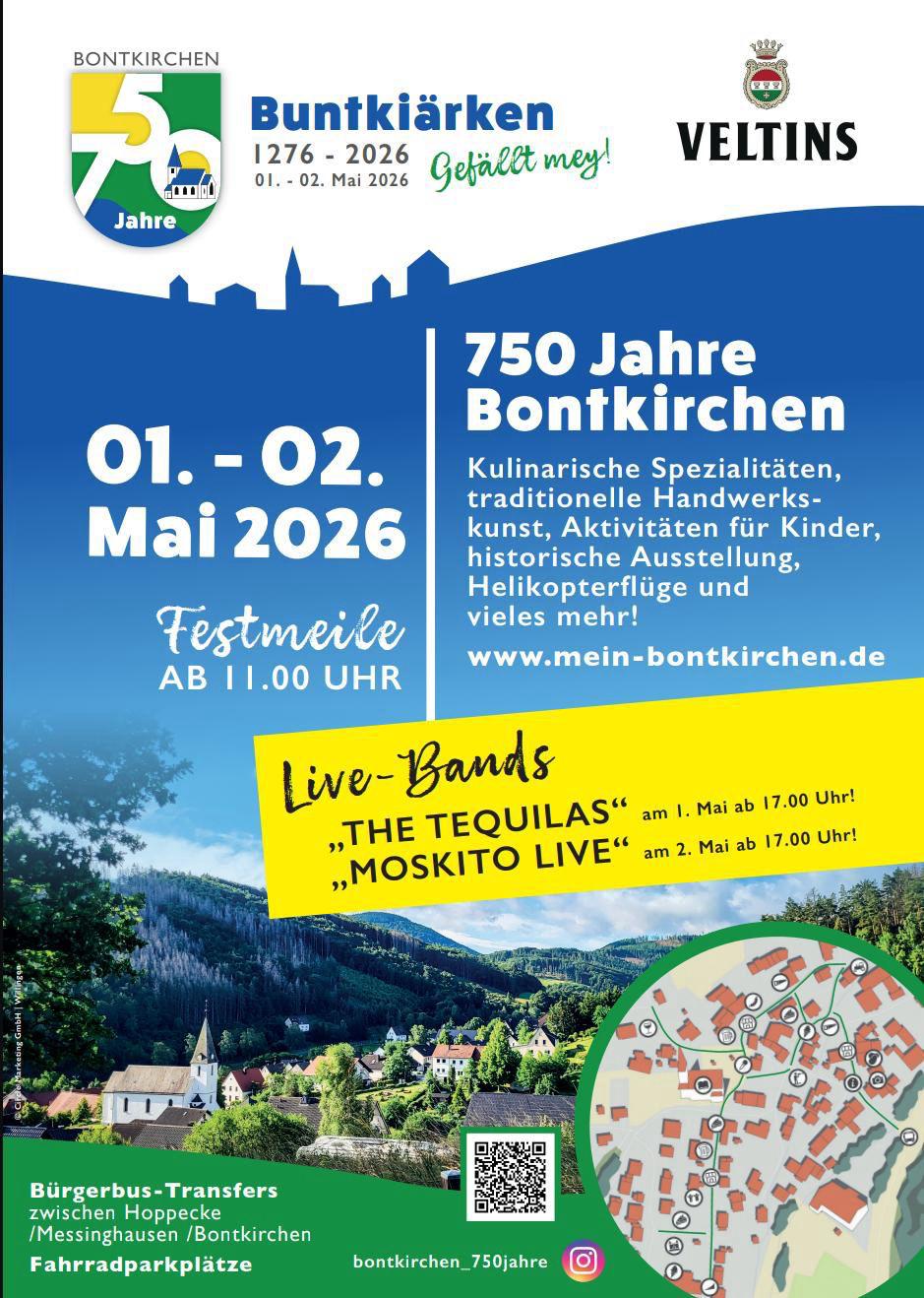 Am 1. und 2. Mai 2026 feiert Bontkirchen sein 750-jähriges Bestehen mit einem großen Dorfjubiläum.